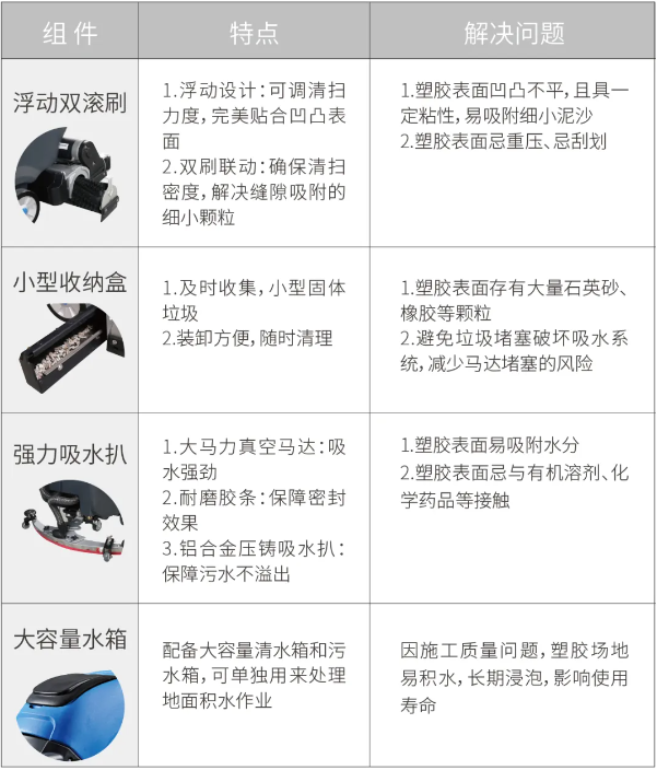 容恩塑膠跑道洗掃一體機系列,集清掃、清洗、吸干為一體,憑借四大核心組件(浮動雙滾刷、小型收納盒、強力吸水扒、大容量水箱),可針對塑膠跑道表面特性,提供有效清潔養(yǎng)護作業(yè),是各類校園、體育場所、公園步道等塑膠地面的養(yǎng)護利器。三種機型,可根據(jù)場地面積適配型號。